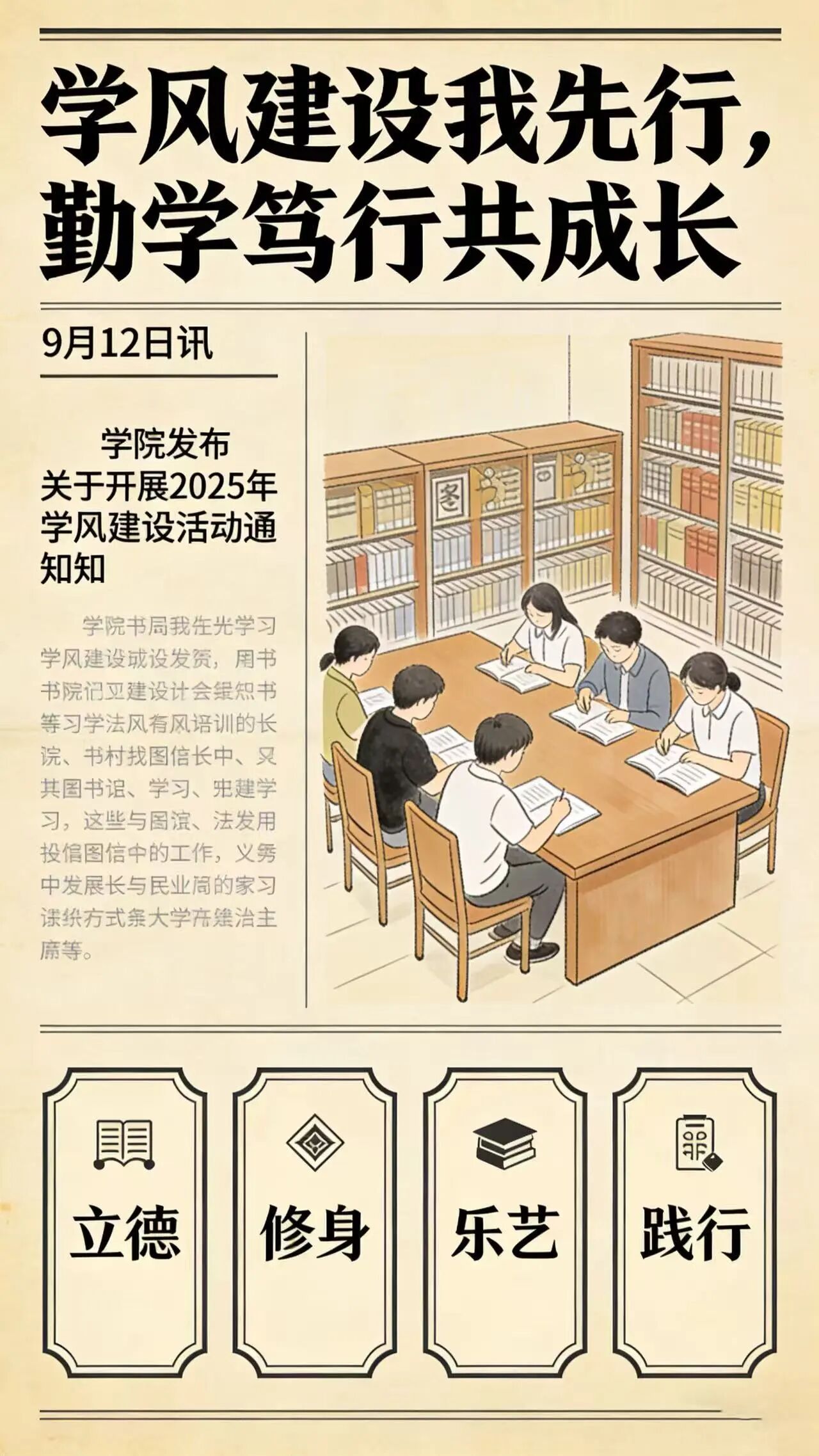 发布《关于开展2025年学风建设活动的通知》,启动“学风建设我先行,勤学笃行共成长”主题活动,着力营造“立德、修身、乐艺、践行”的优良氛围。